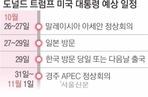도널드 트럼프 미국 대통령의 방한 일정이 아시아태평양경제협력체(APEC) 정상회의 전체 참석이 아닌 오는 29일 당일치기 또는 최대 1박 2일이 될 것으로 알려지면서 그 배경에 관심이 쏠린다.