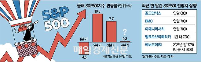 8일 금융투자업계에 따르면 S&P500지수는 전날 소폭 하락에도 지난 4월 8일 대비 35% 상승했다. 4월 8일은 미국의 상호관세 협상 1차 마감 시한이었다. 반 년 새 35% 이상 상승했지만 조정을 경고하는 목소리 대신 월가 금융사들은 S&P500지수 연말 전망치를 올려잡고 있다.
