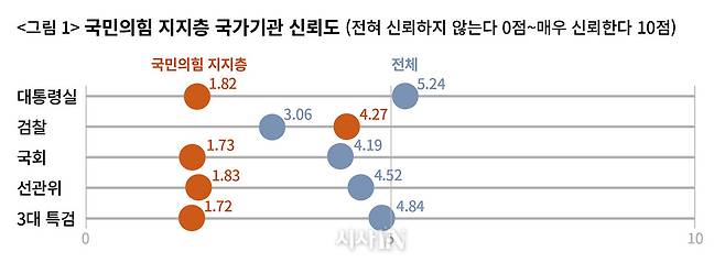 국민의힘 일부 지지층의 극우화 또는 전체 민심과의 괴리를 가늠해볼 수 있는 지표도 이번 조사에서 확인됐다.‘가장 신뢰하는 전직 대통령’을 묻는 문항에서, 국민의힘을 제외한 다른 원내정당 지지자들 중 윤석열을 선택한 응답자는 아무도 없었다. 하지만 국민의힘 지지층 중 7.6%는 ‘윤석열을 가장 신뢰한다’고 응답했다. 이번 조사에서 가장 신뢰하는 국가기관으로 대통령실(5.24점)이, 가장 불신하는 국가기관으로 검찰(3.06점)이 꼽혔다. 하지만 국민의힘 지지층을 대상으로 한 분석 결과는 달랐다. 국민의힘 지지층이 가장 신뢰하는 국가기관은 검찰(4.27점)이었다. 국민의힘 지지층이 가장 불신하는 국가기관은 3대 특검(1.72점)였고, 그 뒤는 대통령실(1.82점)과 부정선거 음모론의 표적이 된 중앙선거관리위원회(1.83점)였다.