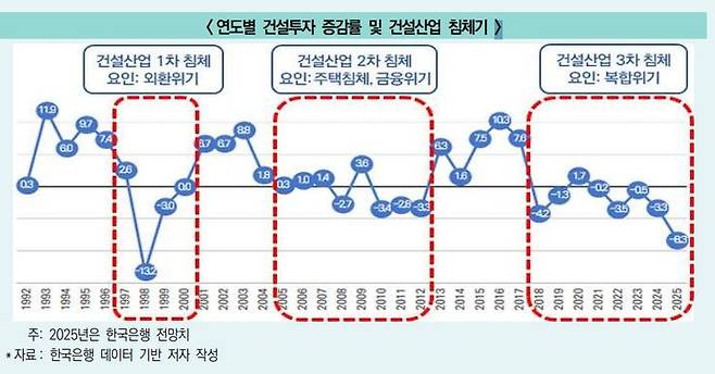 대한건설정책연구원(RICON)의 '건설 BRIEF 90호' 보고서에 따르면, 이번 침체는 과거 외환위기나 글로벌 금융위기와 같은 외부 요인이 아닌, 경제구조, 정책 여건, 투자 상황 등 복합적인 요인이 작용하고 있는 것이 특징이다.