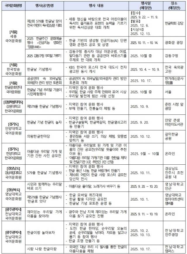 전국 국어문화원과 지방자치단체도 ‘한글한마당’ 행사에 참여해 한글날을 기념하는 다양한 문화행사를 개최한다. 강원대와 영남대, 전남대 국어문화원 등 전국 각지의 22개 국어문화원은 지역 주민이 참여하는 문화행사 등 다양한 온·오프라인 행사를 진행하고, 서울과 대구, 세종 등 지자체도 한글 관련 전시와 체험행사를 통해 알면 알수록 커지는 한글의 매력과 가치를 공유할 예정이다.