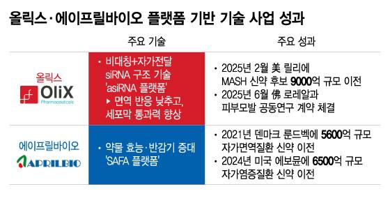 9일 업계에 따르면 에이프릴바이오, 올릭스 등은 최근 주목할 만한 기술이전 성과 또는 기대감으로 업계 차세대 플랫폼 기술이전 주자로 주목받고 있다. 플랫폼 기술을 기반으로 한 신약 후보를 글로벌 기업에 이전한 뒤, 임상 진척에 따른 또 한번의 상업화 품목 배출 가능성을 보유한 유력 주자들이다.