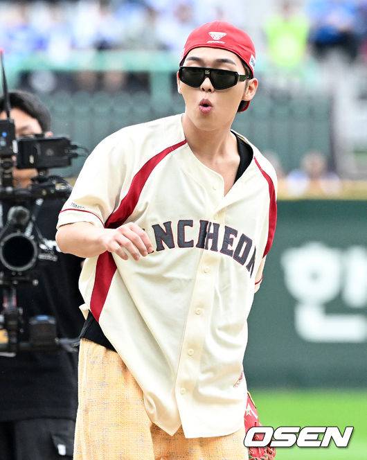 경기에 앞서 배우 최현욱이 시구를 하고 놀라고 있다. 2025.10.09 /sunday@osen.co.kr
