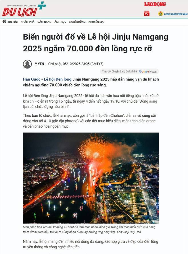 방송사 "호찌민시티텔레비전>(HTV)이 진주남강유등축제 소식을 보도했고, 베트남 국영방송 <보이스 오브 베트남>(VOV)과 일간지 <라오동>(Lao Động)은 각각 "7만 개 이상의 등불이 밝히는 2025 진주남강유등축제", "7만 개의 찬란한 등을 보기 위해 수많은 인파가 2025 진주남강유등축제로 모여 들다"라는 제목의 관련 기사를 게재했던 것이다.