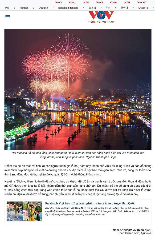 VOV는 "진주남강유등축제가 '역사의 강, 평화를 담다'를 주제로 열리며 7만 개 이상의 유등이 남강과 진주성을 밝히고 있다"며 "임진왜란 당시 유등이 통신과 신호의 수단으로 사용된 역사적 의미를 오늘날 평화와 화합, 희망의 상징으로 발전시켰다"고 소개했다.