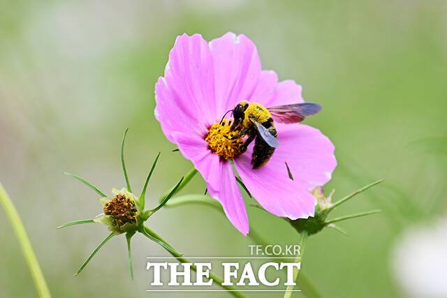 [더팩트ㅣ서예원 기자] 제579회 한글날이자 연휴 마지막 날인 9일 오후 서울 종로구 열린송현 녹지광장에 핀 코스모스 위로 호박벌 한 마리가 먹이활동을 하고 있다.