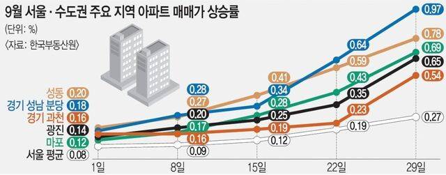 이처럼 한강벨트 집값이 요동치면서 추석 이후 정부가 추가 규제책을 발표할 것이란 전망에 힘이 실리고 있다. 한국부동산원 주간 동향 기준 6월 30일부터 9월 29일까지 최근 3개월간 아파트 매매가격 상승률은 서울 성동구(5.01%), 경기 성남 분당구(4.99%), 경기 과천시(3.81%), 서울 광진구(3.57%), 서울 마포구(3.17%), 서울 양천구(2.88%) 등 순으로 높았다. 이에 서울 성동구와 마포구를 비롯한 한강벨트 권역 및 경기 성남시 분당구 등 가격 오름폭이 두드러지는 지역을 규제지역(조정대상지역·투기과열지구·투기지역)으로 묶은 뒤 추후 토허구역으로 지정하는 방안이 유력하게 거론되고 있다.