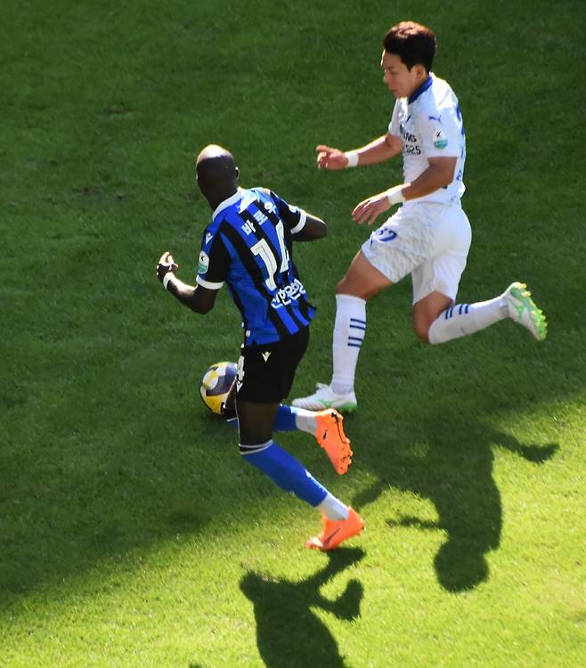 | ▲ 인천 유나이티드 FC 바로우(왼쪽)가 수원 삼성 블루윙즈 정동윤을 따돌리는 드리블 돌파 실력을 뽐내는 순간 |