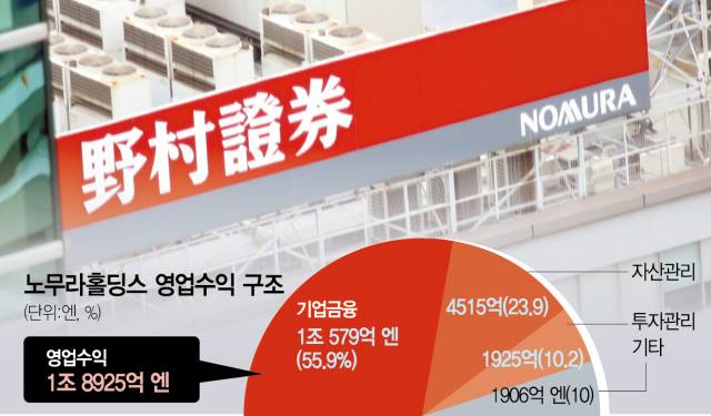 이 외에 개인 고객 중심으로 자산관리 서비스를 제공하는 WM 부문(4515억 엔)과 기관투자가들을 대상으로 펀드·대체투자 상품을 개발·운용하는 투자관리 부문(1925억 엔)이 노무라홀딩스 전체 수익에서 각각 23.86%, 10.2%의 비중을 차지했다. 자산관리 부문 중 중개 수수료 수익에 해당하는 ‘플로 수익’은 전체의 13% 수준에 그쳤다. 국내 증권사 대부분이 개인 거래(리테일)에 수익의 절반 이상을 의존하고 있는 상황과 대조된다.