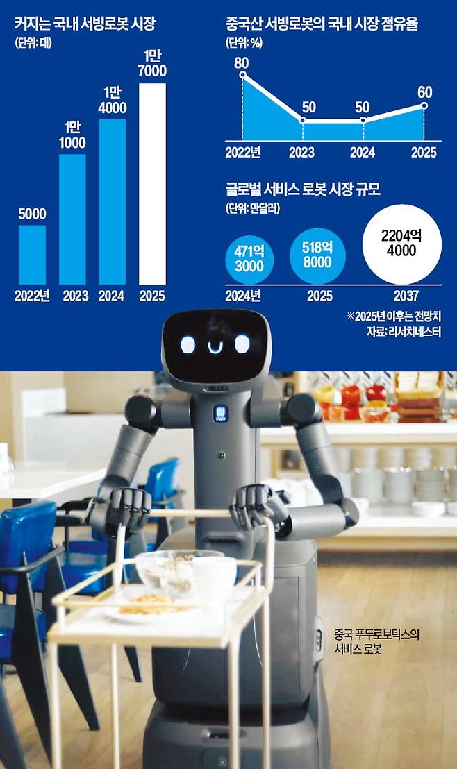 이 시장은 키논로보틱스, 푸두 등 중국 로봇 기업이 장악하고 있다. 시장조사업체 IDC에 따르면 2024년 기준 중국의 글로벌 서비스 로봇 시장 점유율은 84.7%에 달한다. 식당용 서비스 로봇 시장만 놓고 보면 키논이 40.4%로 세계 1위다.