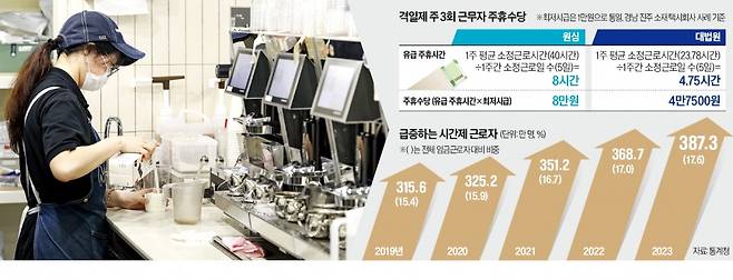 이번 대법원 판결에서 제시된 법리가 격일제 근로자 비중이 높은 소상공인 업계 전체에 적용되면 자영업자들은 인건비 부담을 한층 덜 수 있을 것으로 전망된다. 통계청에 따르면 시간제 근로자는 2023년 387만3000명을 기록해 400만 명에 육박하고 있다. ‘쪼개기 채용’ 관행 확산의 주요인으로 지적된 주휴수당 지급 관행의 근본적인 변화로 이어질지도 주목된다.