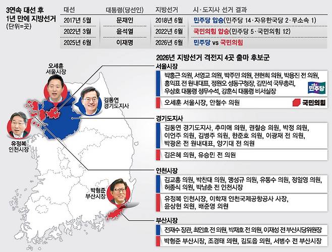 9일 민주당과 국민의힘 모두 지방선거에 대한 전략을 물밑에서 조율하고 있는 가운데 광역 지방자치단체 17곳 중 최대 승부처는 서울시장, 경기도지사, 인천시장, 부산시장 등 4곳이 손꼽힌다. 민주당 내부에서는 "서울시장 탈환이 반드시 필요하다"는 목소리가 나오지만 결과를 낙관하지 못하는 분위기다.