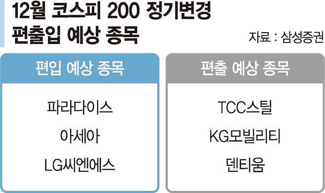 올해 마지막 코스피200·코스닥150 정기 변경이 두 달 앞으로 다가오면서 시장에서는 편출입 예상 종목에 관심이 몰리고 있다.