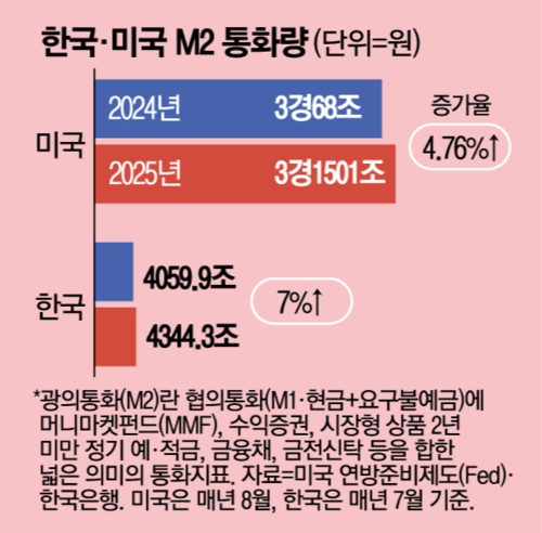 한국도 비슷한 흐름이다. 지난해 7월 4059조9000억원이었던 M2는 올해 7월 4344조3000억원에 이르렀다. 1년 만에 7% 늘어난 것으로 증가세로 따지면 미국보다 더 가파르다.