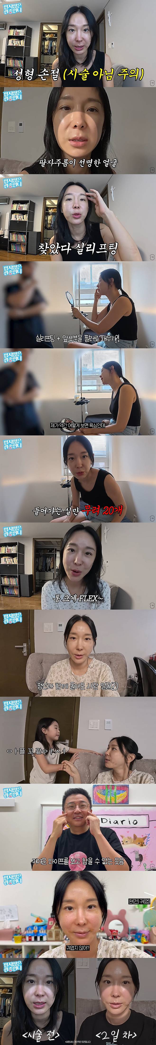 이지혜는 "얼굴이 처진다고 고민하시는 분들 해결책으로는 추천한다. 입술 문신도 괜찮은 것 같다"면서 "실리프팅의 단점은 생각보다 기간이 길다. 일주일 동안 짜증났다. 첫째 날하고 둘째 날은 먹는 것도 힘들고 또 비싸다"며 찐 후기를 전했다. 그러면서 그는 "만약에 다시 하라고 해도 리프팅에 관심 많았어서 다시 할 것 같다"고 밝혔다.