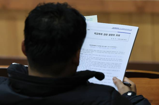 | ▲ 지난해 2월 19일 오전 서울 중구 성동공업고등학교에서 열린 학교폭력 전담 조사관 역량강화 연수 개회식에서 한 조사관이 안내 책자를 읽고 있다. |