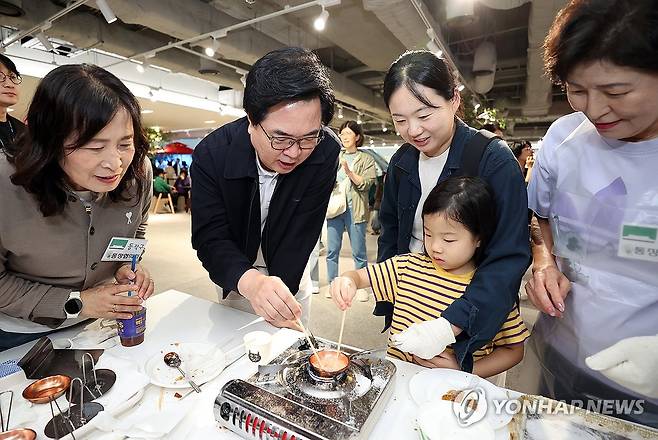 (서울=연합뉴스) 박일하 동작구청장이 9일 서울 동작구 상도동 신청사에서 열린 민족놀이 한마당 잔치에 참석해 한 어린이와 추억의 달고나 만들기를 하고 있다. 2025.10.9 [동작구청 제공. 재판매 및 DB 금지]