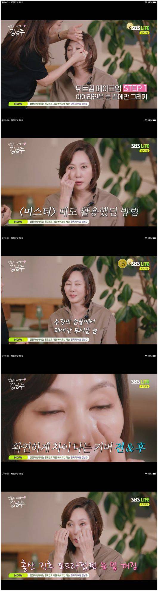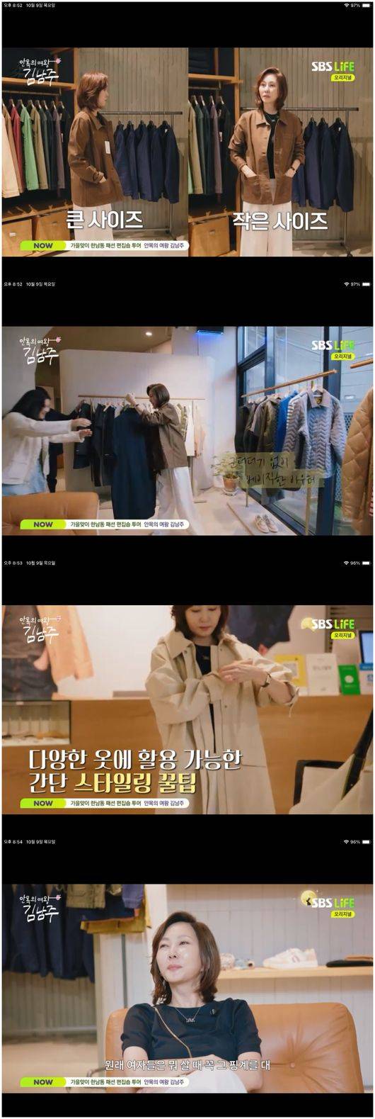 9일 방영한 SBS Life ‘안목의 여왕 김남주’에서는 김남주의 가을맞이 한남동 편집숍 쇼핑 팁, 그리고 김남주의 오랜 친구이자 동료인 이수경 메이크업 아티스트와의 가을 메이크업 꿀팁 전하기 등이 이뤄졌다.