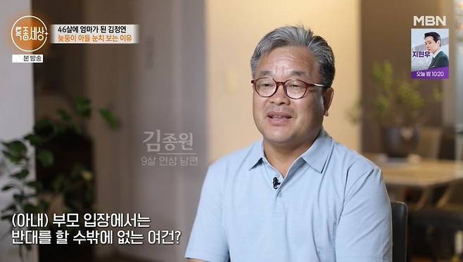 김정연은 공연기획자인 남편, 초등학교 5학년 아들과 함께 살고 있었다. 김정연은 아들을 소개하며 "제가 올해 57세, 아들이 12세다. 46세에 낳았다"라고 밝혔다. 사춘기가 시작된 아들을 상전으로 모시고 있는 부부. 김정연 남편은 사춘기가 제대로 시작도 안 했다는 말에 한숨을 쉬기도.