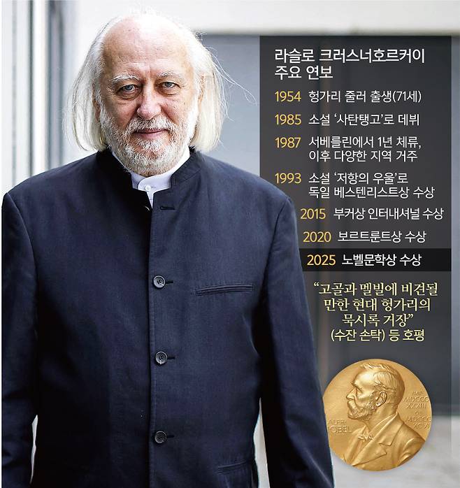 올해 노벨문학상 수상자로 호명된 헝가리 소설가 라슬로 크러스너호르커이(71)는 암울하고 디스토피아적인 이야기를 깊이 있고 통찰력 있는 문장으로 풀어내는 작가로 유명하다.