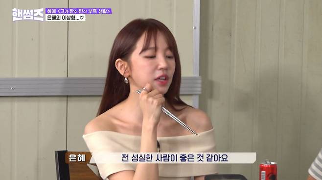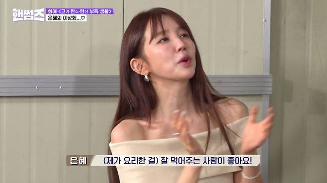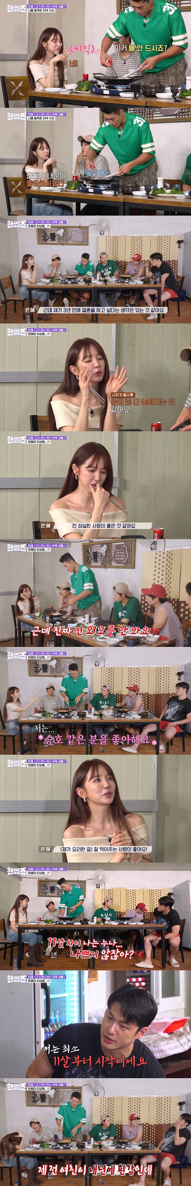 그때 윤은혜는 "나는 승호 같은 분을 좋아한다"고 말했고, 이를 들은 김동현은 "그냥 처음부터 결정돼 있었다"고 해 폭소를 자아냈다. 이에 윤은혜는 "나는 요리 하는 걸 좋아한다. 그래서 내가 요리한 걸 잘 먹어주는 사람이 좋다"고 이유를 설명했다.