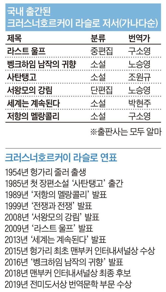 헝가리 현대 문학의 거장, 묵시록 문학의 대가로 불리는 크러스너호르커이 라슬로 (Krasznahorkai László·71)가 올해 노벨 문학상을 받았다.
