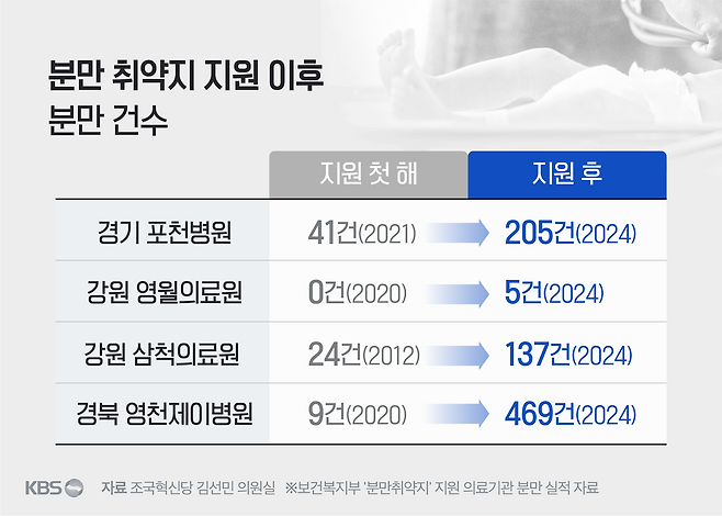 국회 보건복지위원인 조국혁신당 김선민 의원실이 복지부에서 제출받은 자료에 따르면, 실제로 포천에서도 지원 이후 분만 건수가 5배 늘었고, 강원도 영월의료원은 중단했던 분만 진료를 다시 시작했습니다.