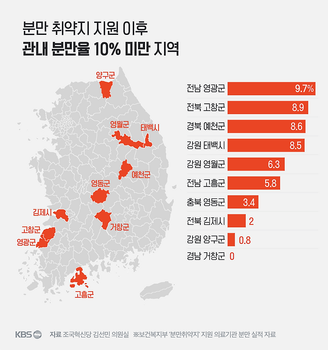 하지만 지원을 받고도 해당 지역 내에서 분만을 하는 비율을 뜻하는 '관내 분만율'이 한 자릿수에 머무는 지역도 적지 않습니다. 여전히 많은 임신부가 다른 지역에서 아이를 낳는다는 건데, 분만 인프라가 충분히 갖춰지지 못한 셈입니다.