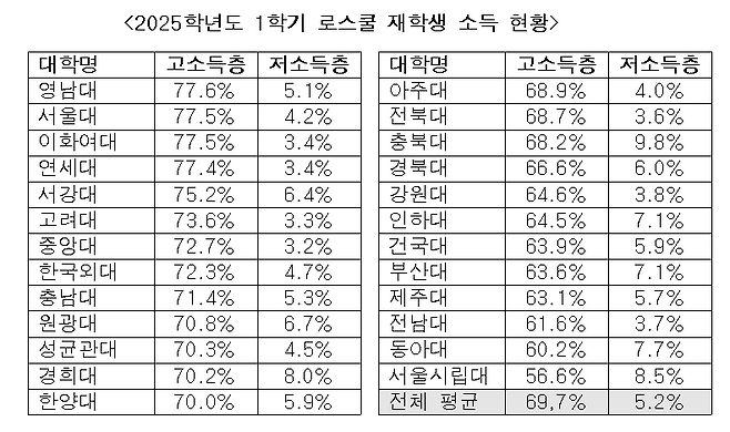 학교별 저소득층 비율은 충북대(9.8%), 서울시립대(8.5%), 경희대(8.0%)가 상대적으로 높았고, 중앙대(3.2%), 고려대(3.3%), 연세대·이화여대(각 3.4%) 등은 낮았다.