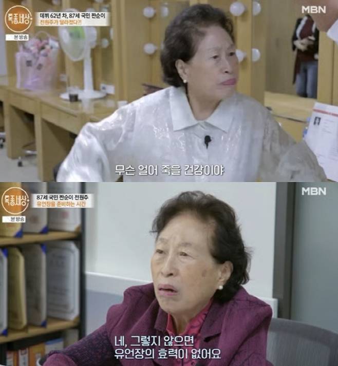 전원주는 변호사를 만나 유언장을 작성했다. 그는 "고생해서 모은 돈을 자식들에게 물려줘야지 그냥 갈 수 없다. 내가 쓸 재산, 노후 준비는 돼 있다. 죽을 때까지 쓸 돈만 챙겨놓고 가야겠다는 생각"이라며 "남편 유언이 '어려운 사람 많이 도와줘라', '인색한 여자가 아닌 성스러운 여자라는 얘기를 들어라'였다. 그게 잊히지 않는다"고 털어놨다.