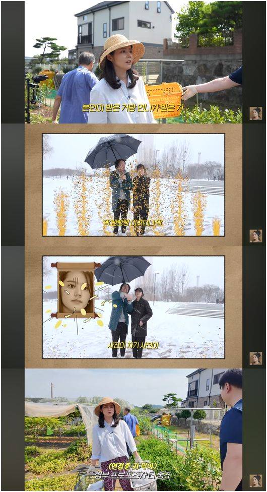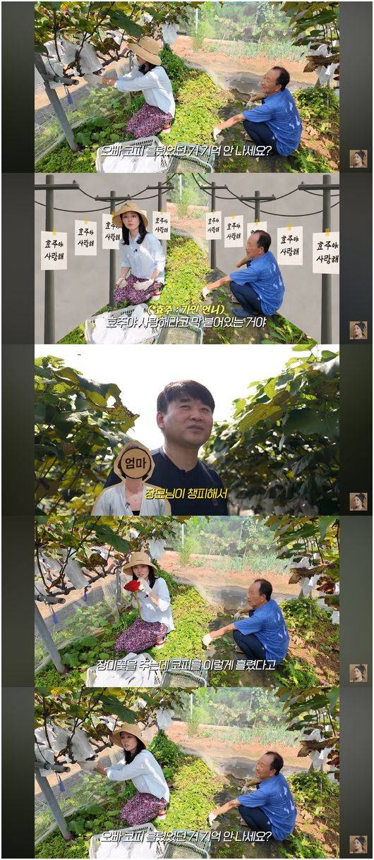 한가인은 이날 샤인머스켓, 배, 쪽파, 노각, 당근을 수확했다. 일을 마치고 나자 새참 겸 점심 잔치가 열렸다. 한가인은 나무 젓가락으로 머리를 틀어올린 채 막걸리를 시원하게 들이켰다. 방금 캔 쪽파와 부추가 듬뿍 들어간 빈대떡까지, 먹음직스럽지 않은 게 없었다.