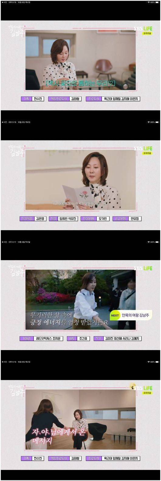 또한 김남주는 팬 레터를 받고 감격했다. 채널명을 지어준 네티즌 ‘와이키키’의 편지였다. 네티즌은 “‘집순이었던 제가 ‘안목의 여왕’을 하면서 같이 가 보는 느낌이었다. 무기력한 삶 속에 엄청난 긍정 에너지를 받았다”, “언니의 행동 하나가 누군가를 움직인다. 지금 모습 그대로 당당하고 행복하길, 김남주로 다시 돌아오길 바라겠다”라며 김남주를 응원했다.