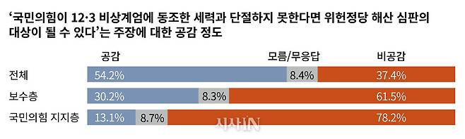 〈시사IN〉은 ‘2025 신뢰도 조사’에서 ‘최근 여권 일각에서 국민의힘이 12·3 비상계엄에 동조한 세력과 단절하지 못한다면 위헌정당 해산 심판의 대상이 될 수 있다는 주장을 제기하는데, 이러한 주장에 대해 공감하는지, 공감하지 않는지’를 물었다. 응답자의 54.2%는 공감한다, 37.4%는 공감하지 않는다고 답했다. 세부적으로는 38.3%가 ‘매우 공감한다’, 15.8%가 ‘대체로 공감한다’, 15.0%가 ‘별로 공감하지 않는다’, 22.4%가 ‘전혀 공감하지 않는다’고 응답했다. 모름/응답 거절은 8.4%였다.