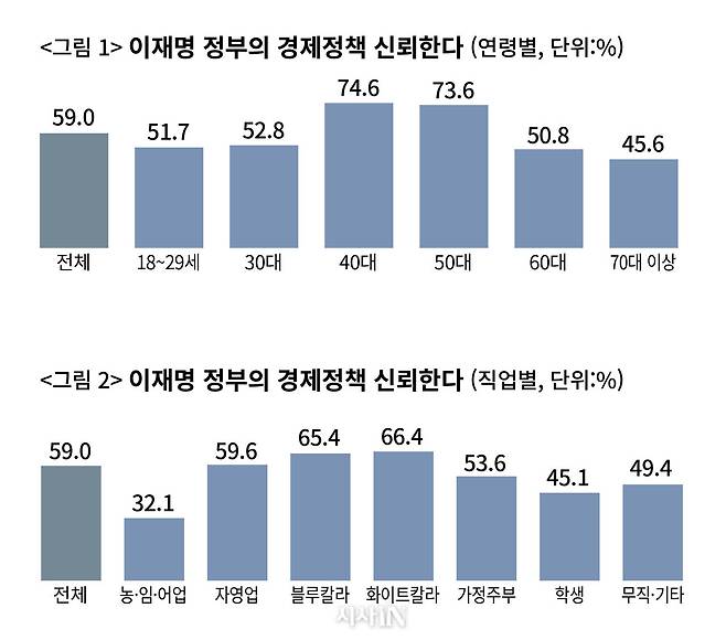 지지 정당이나 정치 성향별 조사가 경제정책 신뢰도에선 무의미할 수 있다. 정치적 지지가 경제정책에 대한 지지로 그대로 반영되는 경우가 많다. 다만 정치 성향에서 중도층의 신뢰도가 지난해 23.7%에서 63.2%로 세 배 가까이 오른 점은 주목할 만하다.