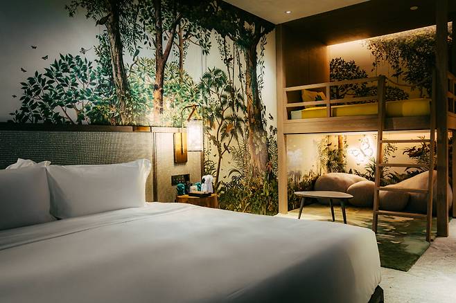 각 객실과 스위트에서는 열대우림, 정원, 저수지의 다양한 풍경을 감상할 수 있다. 객실 내부에는 열대우림의 생태 구조(바닥층, 하층식생층, 수관층, 최상층)를 반영한 예술 작품과 토종 동물들의 석판화가 전시되어 있다. 객실은 자연 환기가 가능하도록 창문을 완전히 개폐할 수 있도록 구성했으며, 중앙통제식인 실내 온도는 열대우림의 서늘한 대기 온도와 유사하게 유지된다.