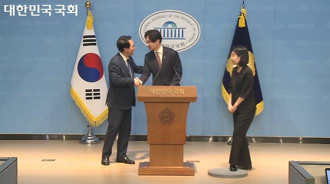 | ▲ 지난 9월 8일 이재명 대통령-여야 당대표 회동 관련 브리핑 당시 박수현 더불어민주당 수석대변인(가장 왼쪽)이 박성훈 국민의힘 수석대변인(가운데)과 공동 브리핑 후 악수를 하고 있다. |