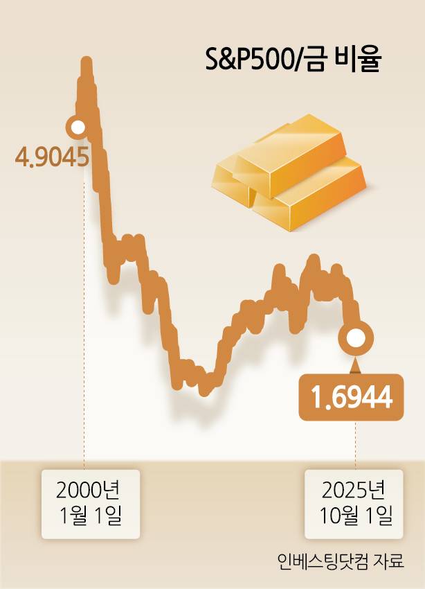 상승세의 무게중심이 점차 금으로 옮겨가고 있다는 평가가 나온다. 10일 금융투자업계에 따르면 S&P500/금 비율은 이날 기준 약 1.69배로 연초 대비 약 21% 하락했다. 2020년 3월 이후 약 5년 반 만의 최저치다. 이 비율은 S&P500 지수를 금 1온스당 가격(달러 기준) 으로 나눈 값으로, 주식의 상대적 구매력을 보여주는 지표다. 수치가 낮을수록 주식보다 금의 가치가 높다는 의미다.