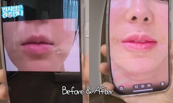 또 이지혜는 스타일리스트의 추천으로 입술 문신도 했다며 결과를 공유했다. "무척 만족한다"며 비교 사진까지 공개한 그는 "실리프팅은 붓기가 생각보다 오래간다. 준비할 때도 수술급이었다. 얼른 부기가 빠지면 좋겠다"고 리프팅에 대한 추가 후기도 전했다.