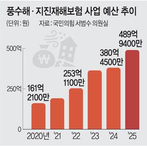 게다가 매년 보험료가 갱신되는 바람에 정부 부담은 갈수록 불어나고 있다. 관련 예산은 지난 2022년 253억1100만 원, 2023년 363억7100만 원, 지난해 380억4500만 원 등 해마다 늘었다. 올해는 489억9400만 원이 편성됐다. 이 보험이 시범운행 중이던 2000년대 중반엔 태풍 루사·매미가 초래한 재산 피해가 컸던 탓에 손보사들이 보험 가입을 꺼렸고, 결국 정부가 손보사에 유리한 구조로 계약을 맺은 결과로 풀이된다. 행안부 관계자는 “보험 구조를 재편하는 방향으로 현재 연구용역을 발주한 상태”라고 해명했다.
