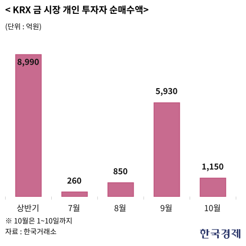 10일 한국거래소에 따르면 개인 투자자들은 지난달 KRX 금시장에서 5930억원어치 금을 순매수했다. 월간 기준으로 올해 최대 규모다. 직전 월간 기준 최대 순매수 규모를 기록한 때는 지난 3월(3290억원)이었다. 이후 단기 급등에 따른 피로감 등으로 4~8월에는 월간 순매수액이 1000억원 미만으로 떨어졌다가 지난 9월부터 매수 규모가 급증했다. 투자자들은 10월에도 약 1220억원어치를 담았다. 하반기 순매수 규모는 이날까지 약 8260억원에 달한다. 금 가격이 오름세를 보이고 있어 조만간 상반기(8990억원) 순매수 규모를 추월할 것으로 예상된다.