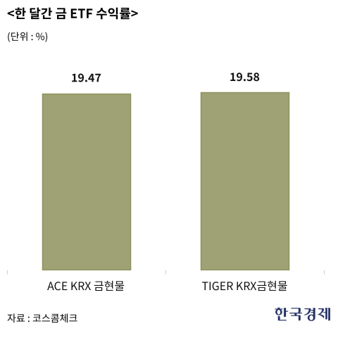 상장지수펀드(ETF) 시장에서도 금 관련 상품에 돈이 모이고 있다. 코스콤 ETF체크에 따르면 최근 한 달 사이 ETF 시장에서 개인 투자자 순매수 3위와 4위는 각각 'ACE KRX 금현물'(2527억원)과 'TIGER KRX금현물'(1945억)이었다. 이들 ETF의 수익률은 각각 19.47%, 19.58%를 기록했다. 같은 기간 코스피지수(8.56%) 수익률을 웃돌았다.