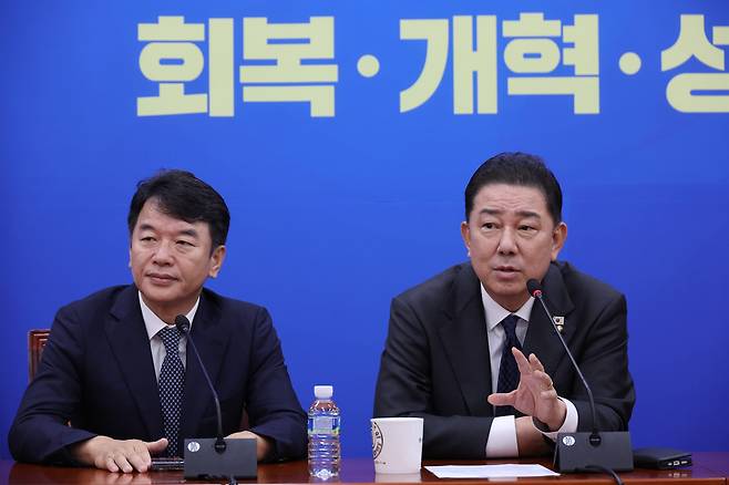 | ▲ 더불어민주당 김병기 원내대표(사진 오른쪽)와 문진석 원내운영수석(왼쪽)이 10일 서울 여의도 국회에서 국정감사 증인채택 관련 브리핑을 하고 있다. |