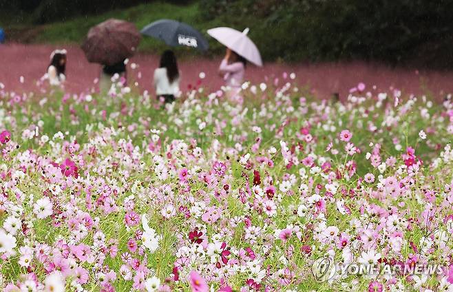 (용인=연합뉴스) 홍기원 기자 = 가을비가 내린 10일 경기도 의왕시 왕송호수 인근에서 시민들이 활짝 핀 코스모스와 핑크뮬리를 보며 가을 정취를 만끽하고 있다. 2025.10.10