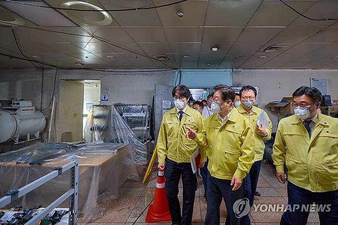 (서울=연합뉴스) 이재명 대통령이 10일 화재 피해 복구작업이 진행 중인 대전 유성구 국가정보자원관리원 대전 본원을 찾아 관계자의 설명을 들으며 현장을 살펴보고 있다. 2025.10.10 [대통령실 제공. 재판매 및 DB 금지]
