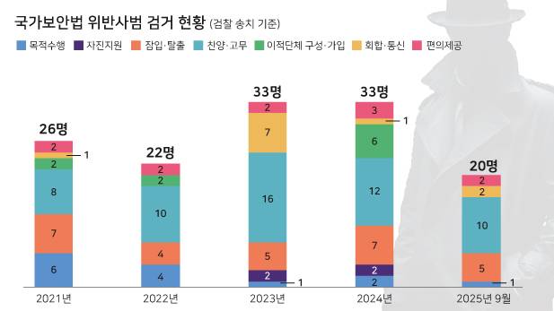 이외 북한 김일성 일가 등을 숭배하는 표현물을 유포하거나 소지한 혐의(국가보안법위반 찬양고무), 북한 공작원과 온·오프라인으로 교신한 혐의(회합통신), 북한에 몰래 재입북하려 한 혐의(탈출예비)를 받는 이들까지 포함하면 최근 5년간 국가보안법 위반사범은 134명에 이른다. 탈북민을 포함한 우리 국민이 132명, 외국인은 2명(미국인 1, 중국인 1)이다.