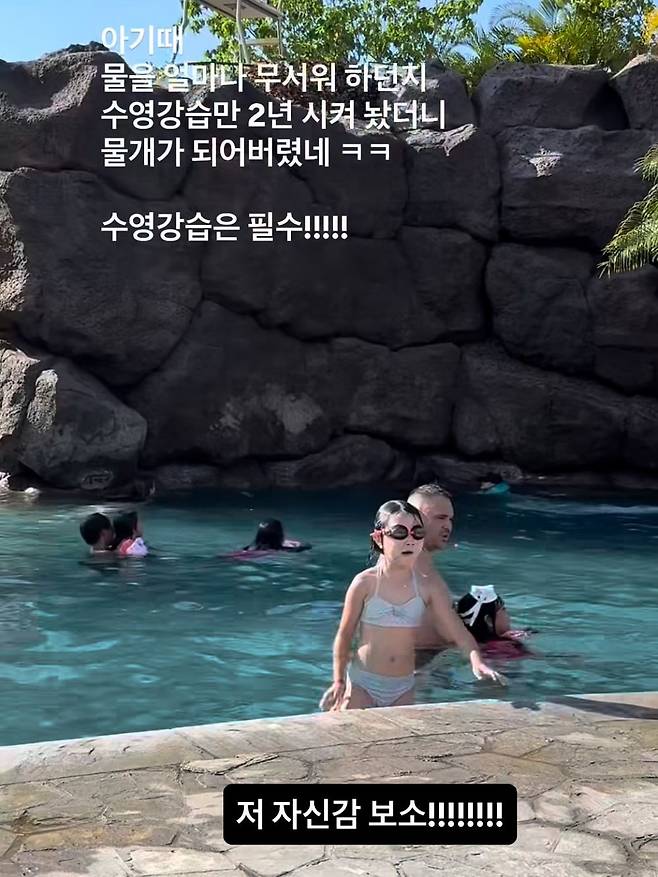 이지혜는 10일 자신의 계정에 "아기 때 물을 얼마나 무서워하던지. 수영 강습만 2년 시켜 놨더니 물개가 되어버렸네. 수영 강습은 필수! 돈 쓴 보람"이라는 글과 함께 수영장에서 촬영한 영상을 업로드했다.