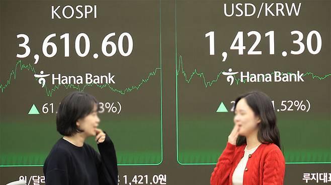 ▲ 10일 서울 중구 하나은행 본점에서 직원들이 주가 및 환율 전광판 앞에서 활짝 웃고 있다.