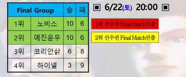 웬만한 공방이나 콤보 등을 모두 마스터한 4인이기 때문에 매우 수준높은 경기가 이어졌는데요, 이 경기에서 노비스님과 예진윤우님이 과거 대방동의 노련함을 바탕으로 코리안삵님과 하이넬님을 꺾고 1위와 2위로 최종 라운드로 직행했습니다.