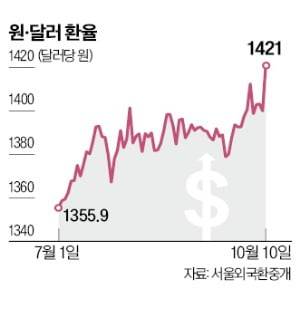 10일 서울외환시장에서 원·달러 환율은 전 거래일보다 21원 오른 1421원에 주간 거래를 마쳤다. 지난 4월 29일(1437원30전) 후 5개월여 만의 최고치다. 상승폭(21원)은 4월 7일 33원70전 후 가장 컸다.
