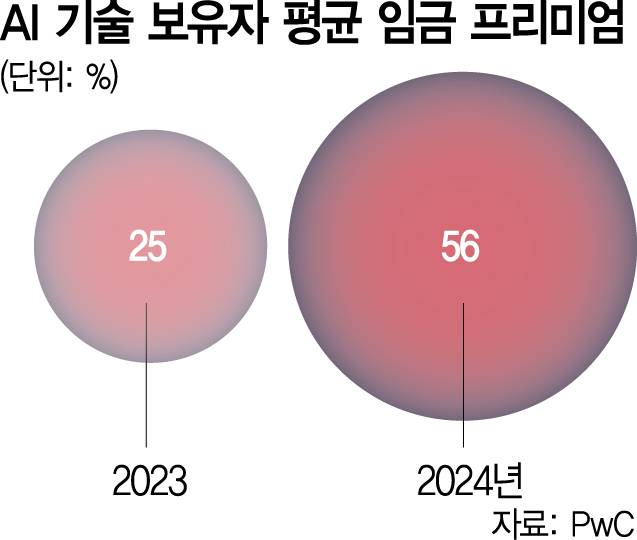 10일 글로벌 컨설팅 업체 프라이스워터하우스쿠퍼스(PwC)의 ‘2025 글로벌 AI 일자리 바로미터’ 보고서에 따르면 AI 기술 보유자의 평균임금 프리미엄은 2023년 25%에서 2024년 56%로 2배 이상 뛰어올랐다. 한마디로 AI 도구를 다룰 줄만 알면 급여를 1.5배 이상 받을 수 있다는 의미다.